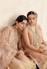Embroidered sequined side panels for front and back on dyed masoori (peach).