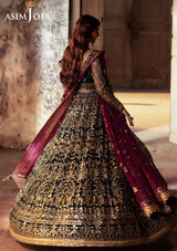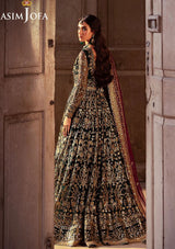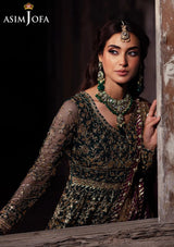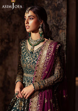 Draped in the emerald richness of a royal garden, this bottle green ensemble captures a timeless elegance. The embroidered Peshwas, a true symbol of regalia, is adorned with gold zariwork winding gracefully among sparkling golden sequins like morning dewdrops. Paired with a magenta embroidered dupatta that mirrors a twilight sky above the garden, this regal creation resonates with an elegance that lingers through the night.
