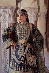 Step into the world of 'Koyal,' an ensemble as captivating as a melodious bird's song, in a stunning kohl-hued color. The silk embroidered shirt is a masterpiece of craftsmanship, featuring hand-embellished ada-work, delicate sequin work, and enchanting card mirror work, elegantly contrasted by satin silk borders. The ensemble is beautifully completed with a silk gharara boasting a floral print and a satin silk embroidered border, adding a touch of whimsical elegance. The printed and embroidered dupatta, with its four-sided satin embroidered border, is the final note in this symphony of style. 'Koyal' is a celebration of grace and artistry, the perfect choice for brides who seek timeless beauty with a touch of the extraordinary.