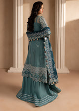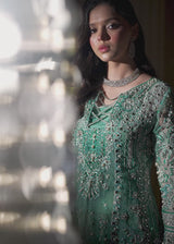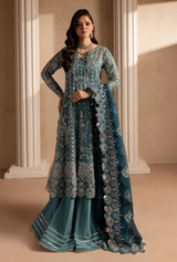 Embroidered and hand embellished pishwas with intricate neckline details, Paired with Flared pants and embroidered dupatta.