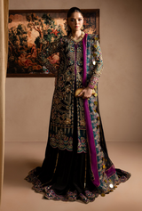 Embroidered and hand embellished front open shirt (appliqued neckline ,sleeves, and shirt panels) Paired with gharara and embroidered dupatta.