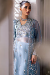 Azura, a vision in sky blue, embodies sheer opulence through its lavish use of frosted organza tulle, renowned for its ethereal translucency. The ensemble's pièce de résistance is the hand-embellished panel shirt, meticulously adorned with a cascade of sequins and iridescent crystals, each glistening under the light to create a spellbinding allure. This exquisite detailing reflects unparalleled craftsmanship,