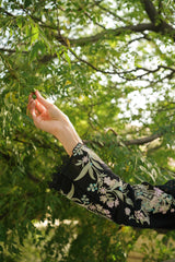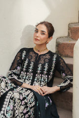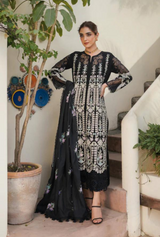 "Pearl," a timeless silhouette fashioned in aesthetic elegance, showcases a black long shirt adorned with intricate floral embroidery on premium lawn fabric, accentuated with vibrant colored stitches, exuding an air of refinement. Complemented by chic cutwork patches along the neckline and sleeves, seamlessly fused into the embroideries, further enhanced with a delicate cutwork border finishing the hem, adding a sleek touch to the piece. Paired with classic black pants and accompanied by a digitally printed Swiss voile dupatta, this ensemble is perfect for any summer soiree.