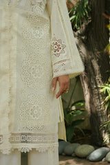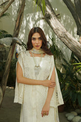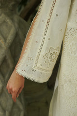 Transform your wardrobe with the exquisite ensemble "Motia", showcasing the off-white kameez features unique cutwork detailed lace on the shirt yoke. The lower panel with stunning schiffli cutwork embroidery, complemented by coordinating laces united with three distinct lace inserts, including a scalloped outer edge and an inner scalloped frame, creating a harmonious fusion of the upper body and lower panel and delicate schiffli cutwork sleeves giving a refined look.