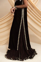 The luxurious formal ensemble showcases a deep brown velvet A-line shirt, accentuated by a handcrafted, embroidered front neck in silver and gold metallics. The piece features dyed net sleeves and is paired with a sophisticated printed net dupatta with an ornate border. Coordinating dark trousers, are finished with an organza patch accent, creating a refined look perfect for an evening occasion.