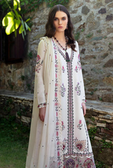 Behold the regal Muguet ensemble: A three-panel symphony of Suzani floral Uzbek embroidery cascading over every inch. Adorned with delicate sleeve embroidery and an ethereal organza patch, its elegance knows no bounds. The Swiss voil dupatta whispers tales of intricate craftsmanship, while the plain cambric trousers lend an air of understated sophistication.
