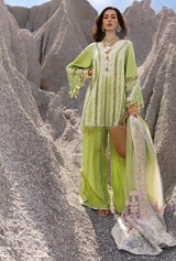- Embroidered Lawn Front Center Panel–1Pc - Embroidered Lawn Front Side Panel-1 Right & Left–1Pc - Embroidered Lawn Front Side Panel-2 Right & Left–1Pair - Embroidered Lawn Back Side Panel-1 Right & Left–1Pair - Embroidered Lawn Sleeves–1Pair - Embroidered Organza Sleeve Motifs–1Pair - Embroidered Organza Neckline–1Pc - Embroidered Cotton Net Dupatta Pallu Motifs Border-1–2Mtr - Embroidered Organza Dupatta Pallu Border-2–1.9Mtr - Embroidered Organza Dupatta Length Sides Border–5.3Mtr - Embroidered Organza Trouser Motifs–1Pair - Solid Dyed Lawn Back–0.5Mtr - Solid Dyed Cambric Trouser–2.5Mtr - Solid Dyed Cotton Net Dupatta Center–2.2Mtr
