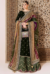 This elegant formal ensemble features intricate embroidery on pure velvet across the front, sleeves, back, and borders, highlighting refined craftsmanship. The dyed raw silk bottom and its embroidered border add a rich texture, while the embroidered organza stitched dupatta complements the look with delicate detail. Perfect for formal occasions, this outfit combines luxurious fabrics and expert embroidery to ensure a sophisticated and timeless appearance.