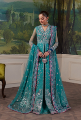 Discover the allure of this stunning Jade green with Serra, a masterful creation that whisks you away to a secret garden. Monochromatic and pink floral bloom across the fabric, accented by shimmering silver sequin and tilla details. The paneled design unfolds like a botanical tapestry, revealing the depth and mystery of this hidden oasis. As the pattern flows down the panels, it draws you deeper into the garden’s secrets. With its luxurious adda work and balanced color palette, Serra embodies feminine sophistication and whimsical charm.
