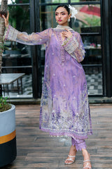 - Printed And Embroidered Organza Shirt With Embellished Neckline Paired With Embroidered Chiffon Dupatta, Dyed Rawsilk Trouser And Inner