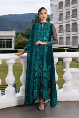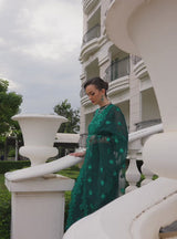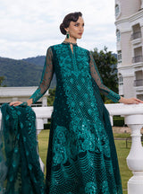 This unstitched wedding festive outfit in emerald green organza is a stunning blend of tradition and modernity. Exquisitely crafted with intricate machine embroidery and shimmering sequins, it offers a touch of luxury and sophistication. The delicate floral and geometric patterns create a captivating design, perfect for any special occasion. The luxurious organza fabric allows for customization to your desired fit and style, ensuring a personalized and glamorous look.