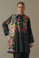 A charcoal shirt inspired by traditional cross-stitch embroidery, paired with matching charcoal trousers for a sleek and cohesive look. The ensemble is brought to life with a bold, colorful paisley shawl that adds vibrance, artistry, and a striking contrast to the deep tones of the outfit.