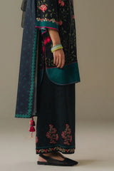 A black shirt inspired by modern chintz patterns, paired with black trousers featuring subtle block print detailing. The look is completed with an olive green and black shawl, adding contrast and depth to this contemporary and elegant ensemble.