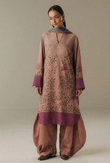 A dusty pink shirt inspired by modern chintz patterns, paired with matching dusty pink trousers featuring delicate block print details. The ensemble is beautifully complemented by a shawl in soft shades of gray and pink, creating a refined, feminine, and effortlessly graceful look.