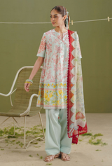 The dupatta is printed with arranged florals and finished with a red scalloped border on off-white. The shirt features peach and pink floral prints on an ice blue base. The trouser is detailed with a pink lace border on ice blue.