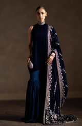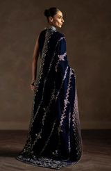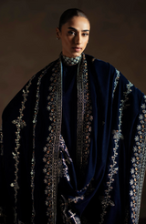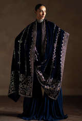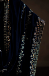 Draped in a deep midnight navy, Avelyn is a velvet shawl defined by its refined elegance and contemporary appeal. Intricate floral and geometric embroidery in antique gold, soft champagne, and subtle copper tones flows across the surface, finished with a richly detailed border that adds depth and structure. The luxurious velvet base enhances the sheen of the embroidery, creating a graceful play of texture and light. Perfect for the festive season, Avelyn is designed to elevate evening and formal looks with modern sophistication and timeless charm.