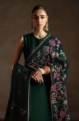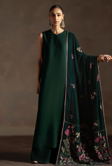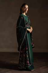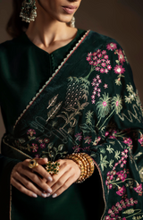 Erynn is a contemporary velvet shawl in a deep emerald green tone, brought to life with delicate floral embroidery in soft pinks, muted golds, and subtle ivory accents. Fine botanical motifs are scattered gracefully across the surface, while a detailed embroidered border adds definition and refinement. The rich velvet base enhances the depth of colour and texture, making Erynn an elegant statement piece. Ideal for the festive season, this shawl pairs beautifully with formal and celebratory ensembles, offering a modern take on timeless festive elegance.