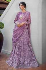 This exquisite ensemble features a hand-embellished front neckline and fully embroidered, sequinned front, back, and sleeves, accented with luxurious organza details. Paired with a cotton silk undershirt, raw silk trousers, and a dupatta with intricate lace, this outfit is completed with exclusive handmade tassels and golden samosa lace for a touch of sophisticated elegance.