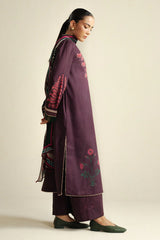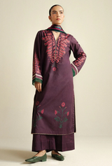 A rich plum maroon shirt paired with a printed trouser and a matching dupatta, creating a timeless contrast of depth and softness.