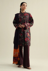 A rich burnt umber shirt featuring intricate kashida-inspired embroidery, paired with a textured trouser and a vibrant dupatta that adds striking contrast.