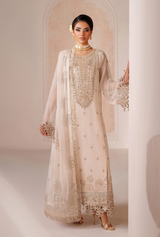 Front crafted in Bamber chiffon and hand-embroidered organza floral and geometric motifs on the neckline and panel. Handmade front border enhances the detailing. Sleeves feature hand-applique motifs, while dyed raw silk trousers provide a structured base. Coordinating the dupatta with matching embroidery completes the artisanal ensemble.