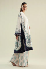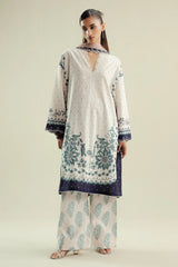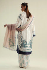 A pearl white shirt layered with shades of blue embroidery, paired with a printed trouser and a tea pink dupatta that softens the palette with graceful ease.
